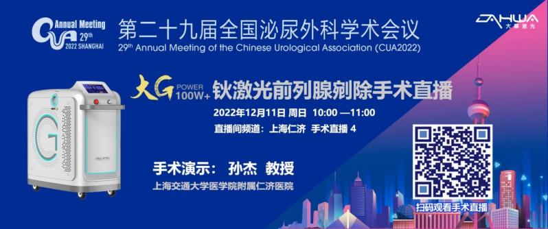第29屆全國泌尿外科學術會議(CUA2022)于12月8日正式拉開帷幕,本次會議以“線上會議”形式云參與、云召開。大華激光公司始終致力服務于泌尿外科的發展和進步。